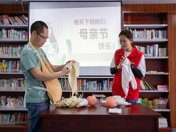 第二个环节是孕肚体验,小朋友小小的身躯戴上沉重的孕肚,模仿妈妈怀孕时捡东西的样子,爸爸们也戴着孕肚给道具宝宝穿衣服、尿不湿。通过体验活动,父亲与孩子们体会到了生命孕育的神奇,也能体会到妈妈怀孕时的辛苦。