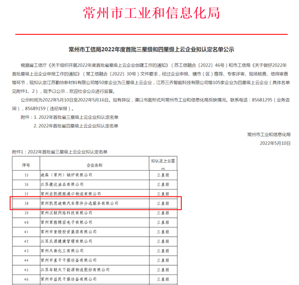 为进一步加快企业“智改数转”步伐,夯实数字化转型基础,有力促进数字化转型供给建设,春江街道经济和科技发展局积极组织企业申报2022年度江苏省首批星级上云企业,经各级部门推荐、专家评审、信用审查等程序,春江街道首家服务业企业——常州凯恩迪斯汽车零件分选服务有限公司成功入选江苏省首批三星级上云企业。目前,春江街道共有四星级上云企业6家,三星级上云企业8家。