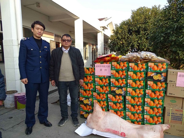 孟河分局党支部一行人为老人们带去了水果、面包、奶粉、猪肉、日用品等慰问品,老人们还主动加入了搬运物资的队伍,纷纷感谢党员同志的牵挂,深深感受到被党员们关心与扶助的温暖。敬老院内呈现快乐温馨、暖意浓浓的景象。