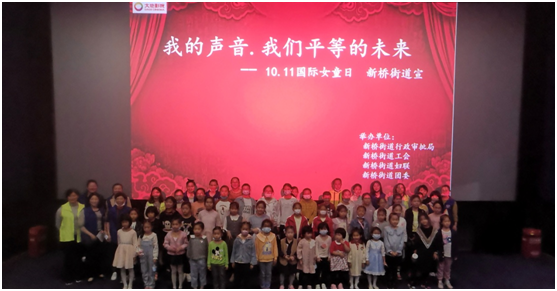 2020年10月11日,是第九个国际女童日,当天下午,新桥街道行政审批局联合街道工会、妇联、团委开展“我的声音.我们平等的未来”——国际女童日活动,组织全镇67户女童家庭(共计144人)观看电影《夺冠》。