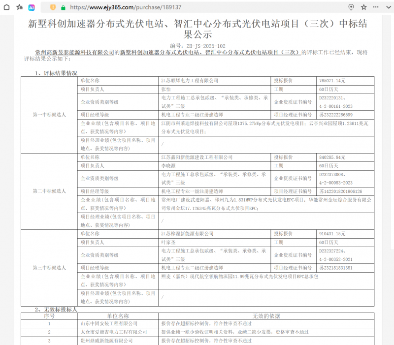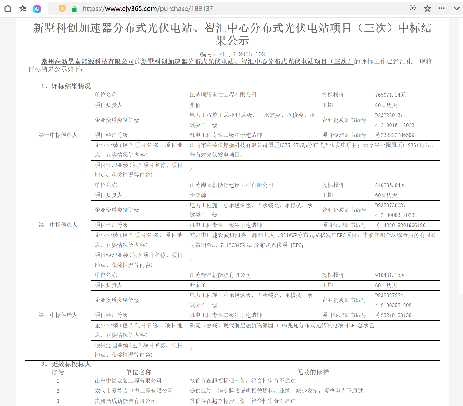 新墅科创加速器分布式光伏电站、智汇中心分布式光伏电站项目(三次)中标结果公示 ,详见高铁新城公司和常高新集团公开交易平台(下图网址)网站。
