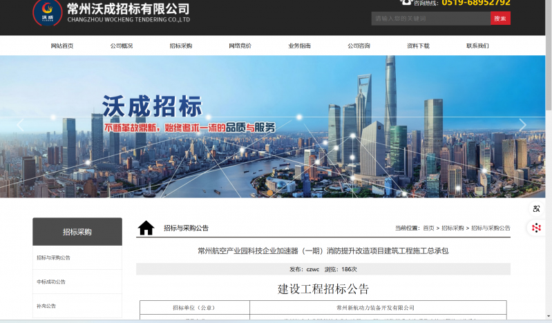 常州航空产业园科技企业加速器(一期)消防提升改造项目建筑工程施工总承包招标公告,详见常州沃成招标有限公司(下图网址)网站,查看。