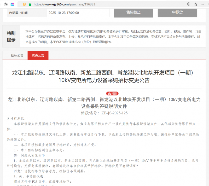 龙江北路以东、辽河路以南、新龙二路西侧、肖龙港以北地块开发项目(一期)10kV变电所电力设备采购招标变更公告 ,详见高铁新城公司和常高新集团公开交易平台(下图网址)网站。