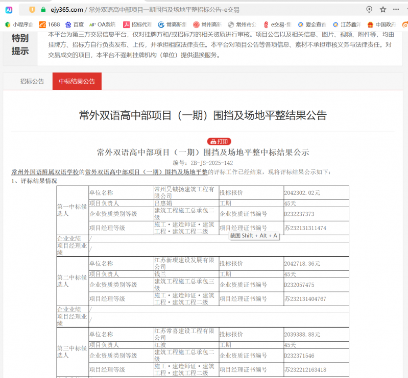常外双语高中部项目(一期)围挡及场地平整中标结果公示,详见高铁新城公司和常高新集团公开交易平台(下图网址)网站。