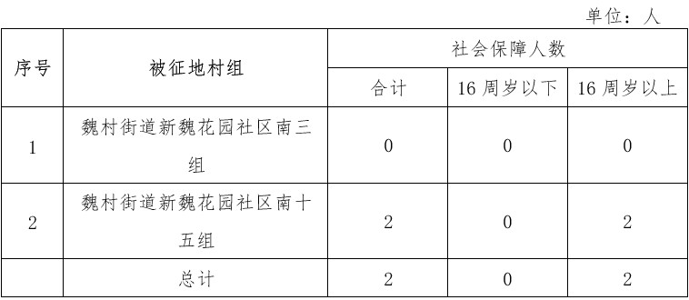 本次征收土地涉及被征地农民的安置和社会保障按照《省政府关于印发江苏省被征地农民社会保障办法的通知》(苏政发〔2021〕87号)的规定执行。不满16周岁的安置人员不作为被征地农民参加城乡社会保障,其本人的安置补助费由设区的市、县(市、区)人民政府按规定足额支付。各年龄段拟安置情况如下:
