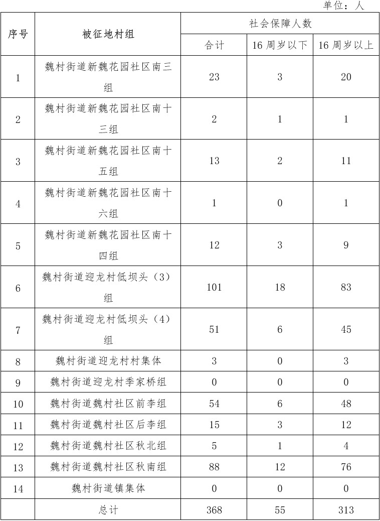 本次征收土地涉及被征地农民的安置和社会保障按照《省政府关于印发江苏省被征地农民社会保障办法的通知》(苏政发〔2021〕87号)的规定执行。不满16周岁的安置人员不作为被征地农民参加城乡社会保障,其本人的安置补助费由设区的市、县(市、区)人民政府按规定足额支付。各年龄段拟安置情况如下: