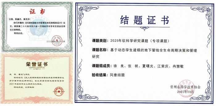 学术研究方面,《常州市存量数据转换地理实体技术路线探讨》《面向高质量发展辅助决策的地图产品设计》等13篇论文在《现代测绘》等期刊和学术年会论文集发表。其中,中心推送的《多源数据融合的智慧招商系统框架设计》《无人机倾斜摄影测量技术在河塘清淤土方计算中的应用研究》两篇论文分别荣获第二十六届华东六省一市测绘学会和江苏省测绘地理信息学会2025年学术年会优秀论文三等奖;《基于动态孪生建模的地下管线全生命周期决策和管理研究》申请常州市科协2025年度软科学研究课题并顺利结题。