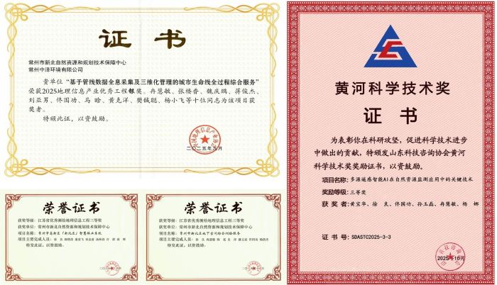 项目荣誉方面,成果尤为亮眼:在12月19日召开的江苏省测绘地理信息学会2025年学术年会中,中心申报的“常州高新区(新北区)智慧林业系统”“常州市新北区地下空间综合测绘服务”项目均荣获2025年度江苏省优秀测绘地理信息工程三等奖;“基于管线数据全息采集及三维化管理的城市生命线全过程综合服务”更是获得2025年度中国地理信息产业优秀工程银奖;此外,“多源遥感智能AI在自然资源监测应用中的关键技术”荣获2025年度黄河科学技术三等奖。一系列奖项,印证了中心在学术和应用领域的卓越追求和阶段性成果,它们不仅仅是努力的刻度,更是中心持续成长的催化剂。