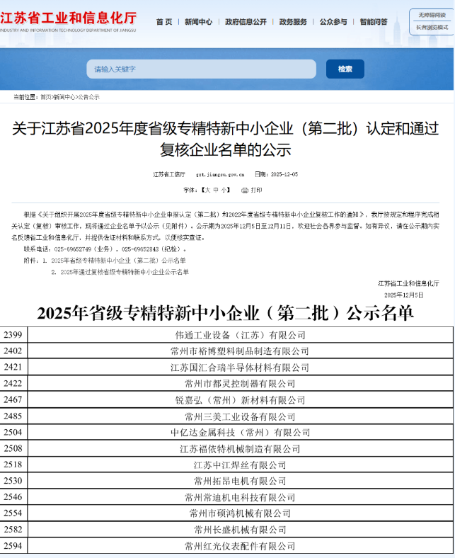 12月5日,江苏省工业和信息化厅公示了江苏省2025年度省级专精特新中小企业(第二批)企业名单,春江街道14家企业榜上有名,入选数创历史新高。