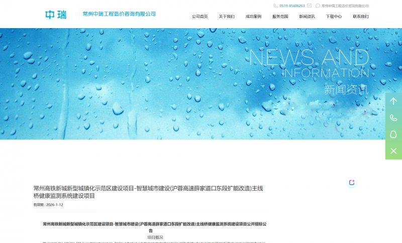 常州高铁新城新型城镇化示范区建设项目-智慧城市建设(沪蓉高速薛家道口东段扩能改造)主线桥健康监测系统建设项目,详见常州中瑞工程造价咨询有限公司(下图网址)网站,查看。
