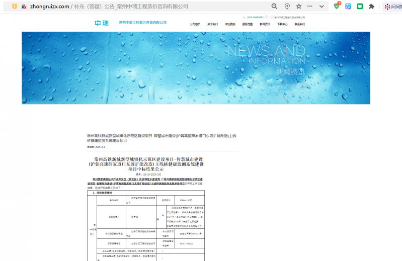 常州高铁新城新型城镇化示范区建设项目-智慧城市建设(沪蓉高速薛家道口东段扩能改造)主线桥健康监测系统建设项目中标结果公示,详见常州中瑞工程造价咨询有限公司(下图网址)网站。