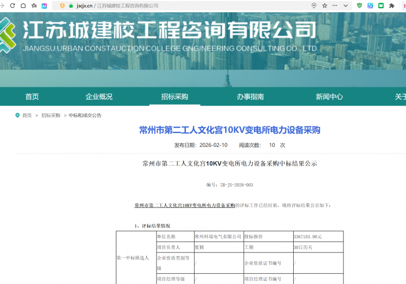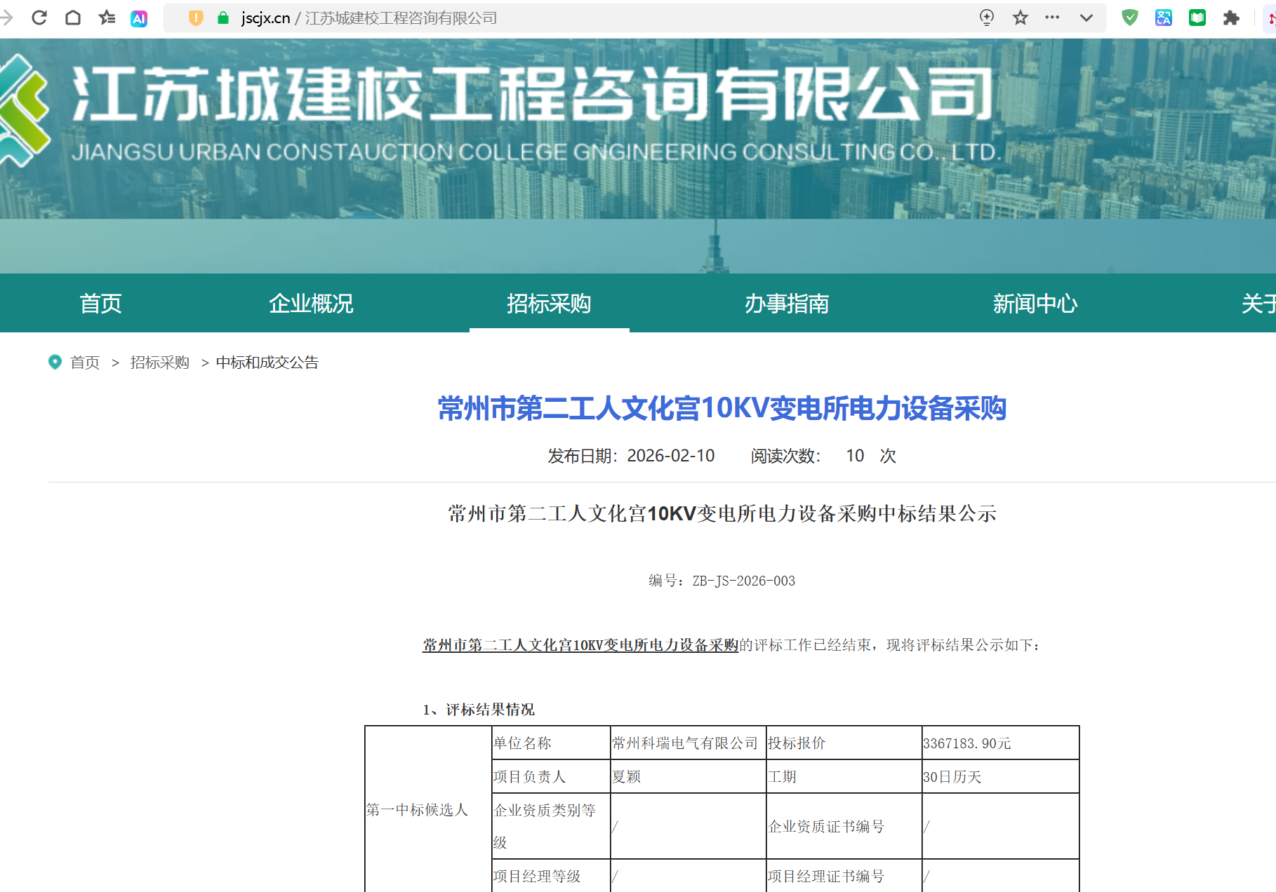 常州市第二工人文化宫10kV变电所电力设备采购中标结果公示